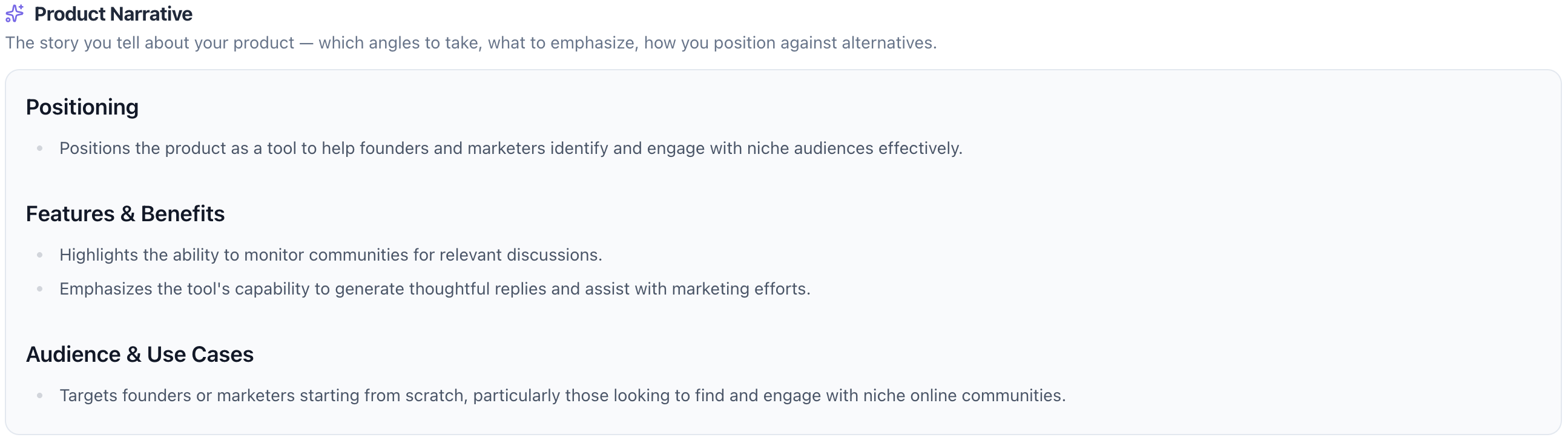 Another crucial aspect of marketing is the story you tell. You want to clearly articulate why your brand stands out, the exact market gap you're addressing, and the hero product or feature that entices customers. Market's Scout gives you a dedicated section to define this Product Narrative. Better yet, the AI will also suggest updates to your narrative whenever it learns from your replies, continually refining how your story is positioned based on your actual responses.