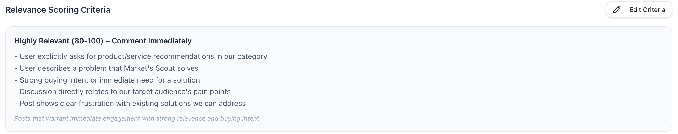 Crucially, Market's Scout lets you define your own custom "Relevance criteria"—a huge gap in the market today, as most apps don't let you dictate exactly what matters to your business. While we provide smart default criteria to start with, you can completely fine-tune it to your unique needs.