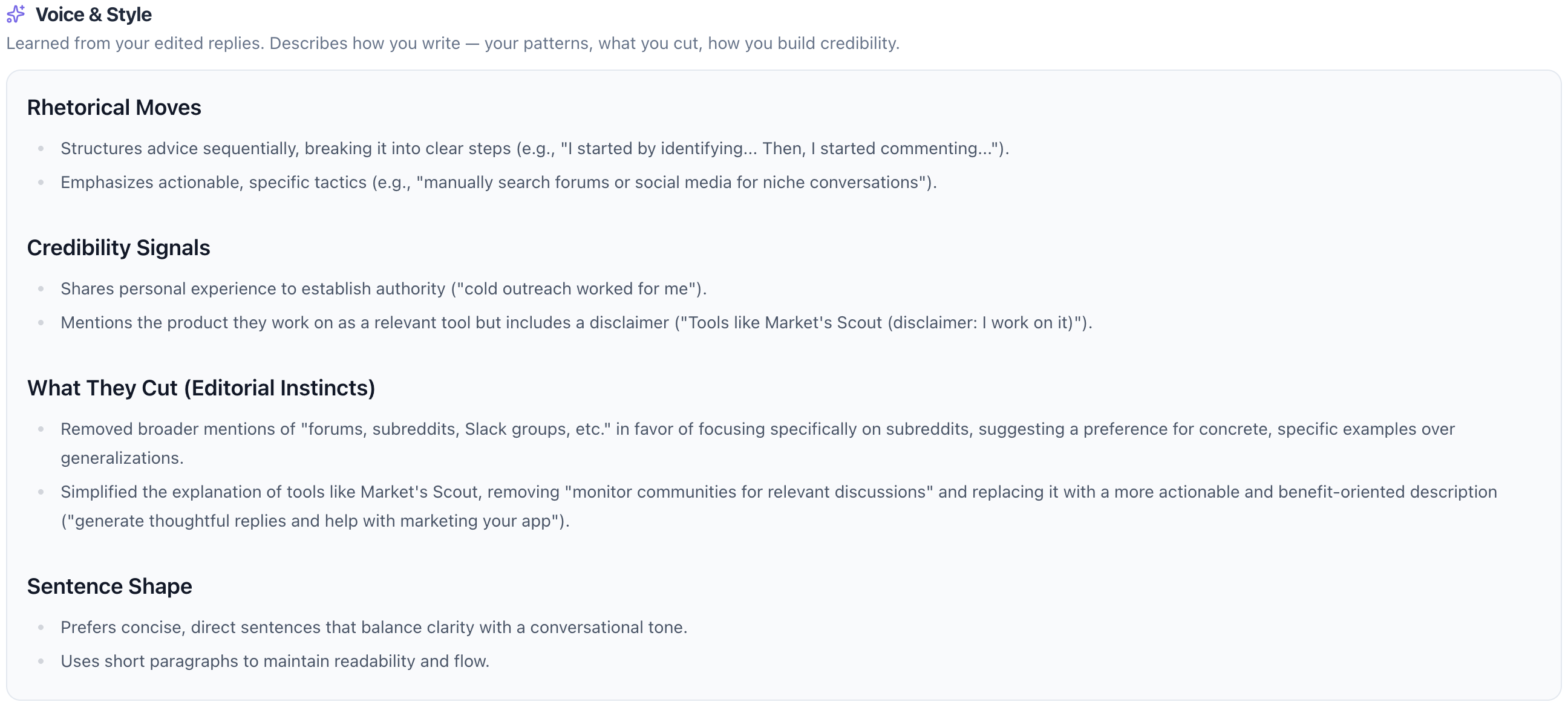 This is where Market's Scout's "Learn from Reply" feature comes in. When you edit a generated reply and save it, you can click "Learn from Reply." The AI instantly analyzes your edits to understand your brand voice, tone, and rhetorical patterns—suggesting updates to your brand's voice profile so you don't have to manually define it.